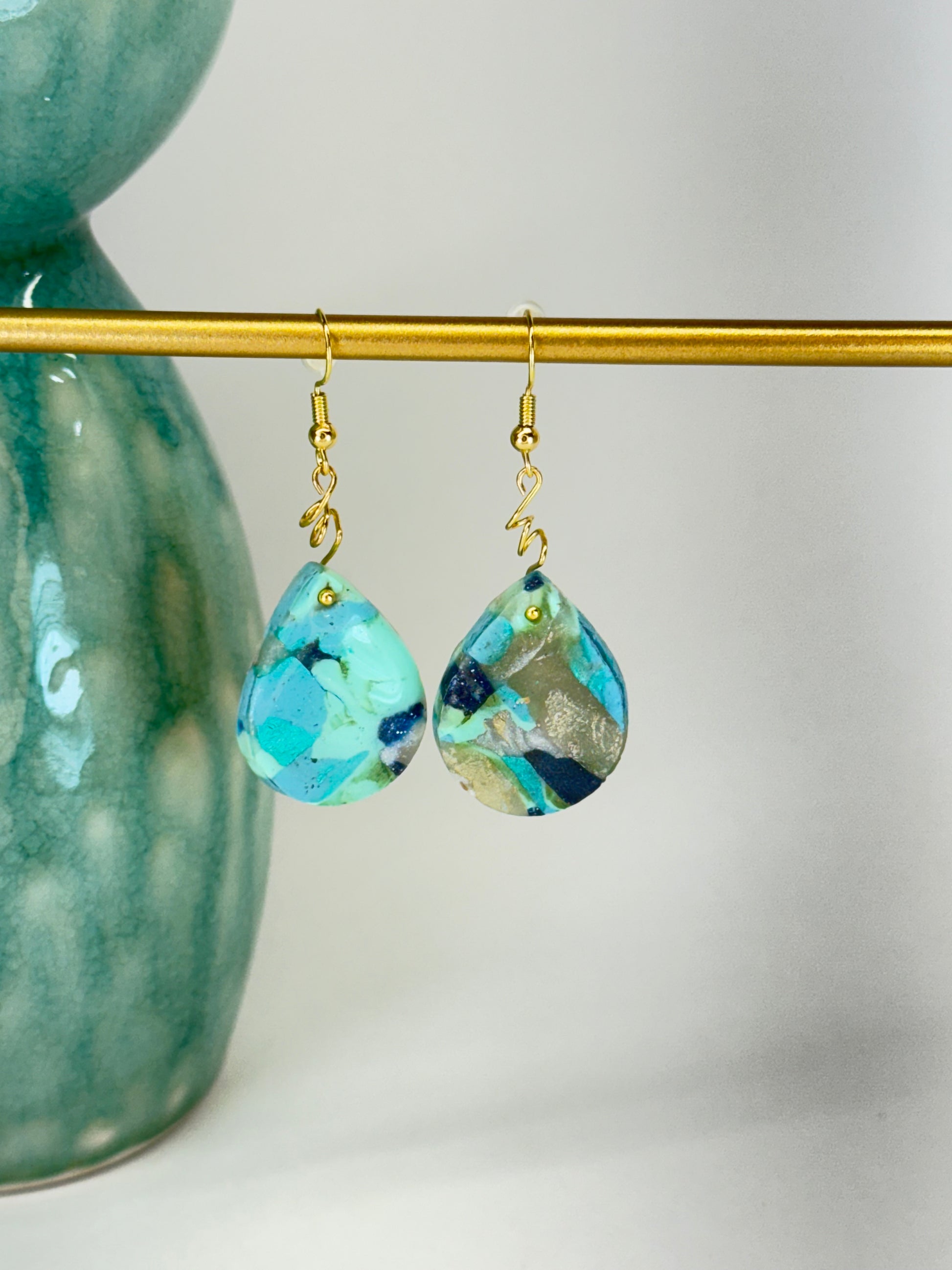 Exclusive to Chestnut Chic Studio, these stunning multi-colored “Turquoise” earrings are bursting with pops of rich turquoise, darn navy blue, veining of metallic golds and silver. High gloss resin top coat amplifies the natural stone-looking finish, and the sleek hand-twisted gold findings add an additional sparkle to these chic earrings. This elegant and truly one-of-a-kind pair is something you’ll adore all year long.